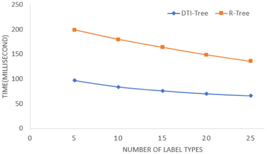 To test the impact of the label types in the process of similarity query, we change the label types in DS1 from 5 to 25. If the query input timeline is same as Figure 15, that is the query input timeline’s label types is fixed, the results of DTI-Tree and R-Tree are shown in Figure 16. The similarity query performance will slightly improve, because the RDD filter function can filtrate more intervals by label type equation to reduce the similarity computation in the later stage. However, if the label types of the input timeline for query increase with the DS1’s label types, then the similarity query performance will not change or decrease slightly. In the other words, the impact of the label types is slight because the impact is mainly in memory computation. When comparing to the disk IO and network IO, the memory computation time is a little part of them.