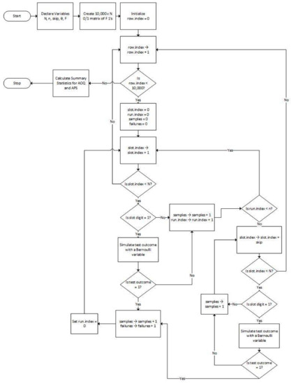 Figure 2 shows a flowchart that guided the design of the simulation algorithm. The essential idea of the design is to populate a matrix of 10,000 rows and N columns with 0 s and 1 s subject to the constraint that each row has F 1 s randomly slotted into the columns. The rows of the matrix are processed independently as batch replicates.