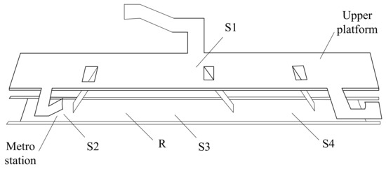 The measured metro station is an early station. Passengers can go down to the metro station from the upper platform by three staircases. The measured temperature points were distributed at four locations—S1, S2, S3, and S4 (Figure 2). S1 was at the upper platform and its temperature was very similar to the air supply temperature of the air conditioning system. S2, S3, and S4 were at the lower platform. Point R was the passenger flow monitoring point.