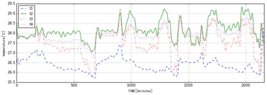 - The temperatures were monitored for 3 days and recorded every 2 min for a total of 2160 data points. T1, T2, T3, and T4 are temperatures at S1, S2, S3, and S4, respectively, as shown in Figure 3. They were processed from the primitive data with a Butterworth filter. The first 720 data points were measured on Sunday; the second and third lots of 720 data points were measured on Monday and Tuesday, respectively.