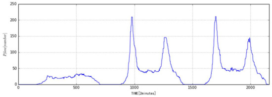 - The passenger flow monitoring point was at Point R. The number of passengers, Pflow, was monitored every two minutes. Figure 4 is the passenger flow curve after processing with median filtering. It is very obvious that the passenger flow data is very different between weekdays and weekends.