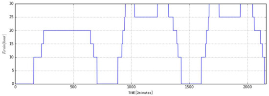 - Since the metro arrival frequency, Ftrain, varies significantly with the time and the number of passengers, Figure 5 gives the change of Ftrain with time. It can be seen that Ftrain is obviously changed with the morning and evening rush hours. Ftrain is also different for weekdays and weekends.