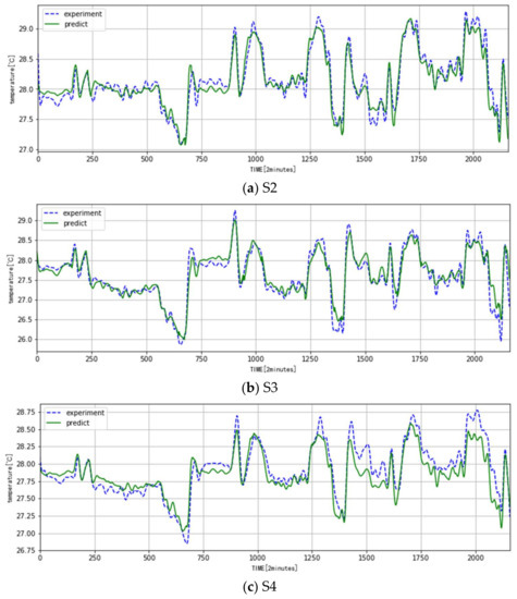 In practice, there are many parameters that will influence the climate, such as the air velocity, the relative humidity, diffused and direct solar radiation, and the latent thermal load due to the presence of people. Because of the limitations of our measuring instruments, only the parameters of temperature and relative humidity could be measured at S1, S2, S3, and S4. The measured data should be integrated with acquired air velocity and diffused/direct solar radiation data, which are very important for the evaluation of the local comfort [21,22,23]. In later analysis, we found that the relative humidity did not fluctuate greatly and remained within a certain range; hence, the relative humidity and temperature were not strongly correlated. The relative humidity was therefore not used to predict the temperature. In addition, the airflow velocity in the subway station is related to the frequency of the subway trains, and the radiation is related to the number of passengers. Therefore, our temperature prediction was finally based on the temperatures in different places, passenger flow, and metro arrival frequency.