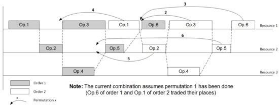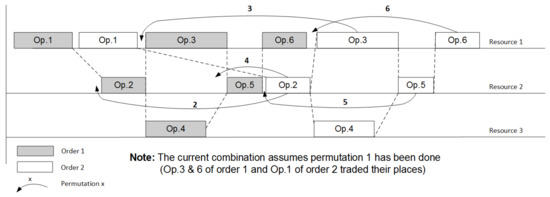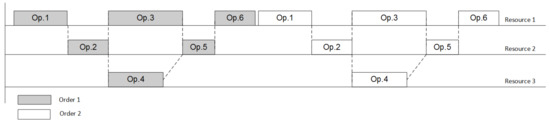 Let us choose the strategy of enumerating permutations of operations in such a way that it explicitly and easily affords to apply branch-and-bound method. The starting point of the enumeration will be the most obvious positioning of orders in a row as shown in Figure 2. We start from the point where the problem is guaranteed to be solvable—when all orders are planned in a row—which means that the first operation of the next order starts only after the last operation of the previous order is finished. If the preceding graph is correct and the resources are enough that means the single order can be placed on the resources that are totally free (the problem is solvable—we do not consider the unpractical case when the graph and/or resources are not enough to fulfill a single order). Infeasibility here can be reached only in the case when we start mixing the orders. This guarantees that the linear programming problem is solvable, however, this combination is far from being optimal/reasonable.