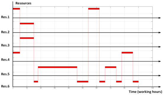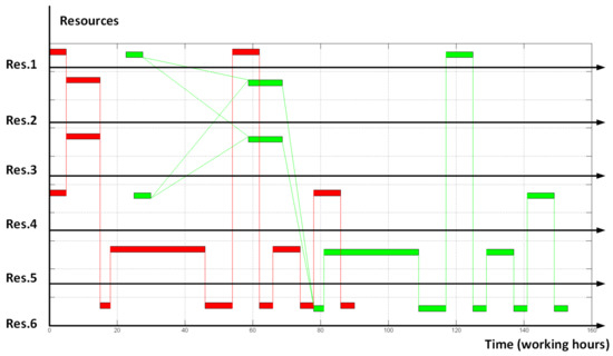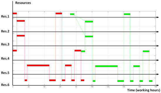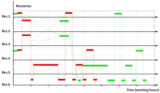 As a reference trial example let us take the following scheduling problem. The manufacturing procedure contains 13 operations that require 6 different resources. The schedule of the manufacturing procedure for a single order is shown in Figure 5. In this example, we want to place two orders at the depicted resources and start evaluating from the point ‘all orders in a row’ (see Figure 6).