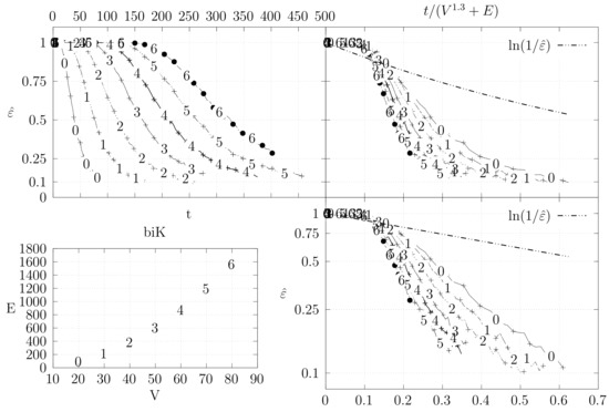 - The top right plot is similar to the top left, but the x axis contains the number of iterations divided by . Besides the data this plot also shows a plot of for reference.