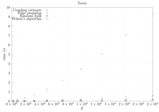 We now present experimental results for larger graphs where we use the optimistic coupling. All experiments were conducted on a computer with an Intel(R) Xeon(R) CPU E5-2630 v3 @ 2.40 GHz with 4 cores and 32 GB of RAM. We present running times for different graph topologies and sizes in Figure 26, Figure 27, Figure 28, Figure 29, Figure 30, Figure 31 and Figure 32. Note beforehand that the coupling estimate needs only to be computed once for each graph. Once the estimate is known, we can generate as many spanning trees as we want. Although the edge-swapping method is not always the faster compared with the random walk and Wilson’s algorithms, it is competitive in practice for dmP and torus graphs, and it is faster for biK, cycle and sparse (ladder) graphs. As expected, it is less competitive for dense graphs. Hence, experimental results seem to point out that the edge-swapping method is more competitive in practice for those instances that are harder for random walk-based methods, namely biK and cycle graphs. The results for biK and dmP are of particular interest as most real networks seem to include these kind of topologies, i.e., they include communities and they are scale-free [13].
