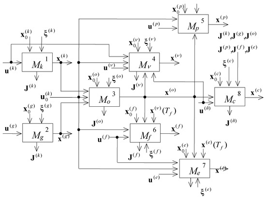 Overall, the constructed model (1) is a deterministic, non-linear, non-stationary, finite-dimensional differential system with a reconfigurable structure. Figure 1 shows the interconnection of models , , , , , , , and embedded in the generalized model.