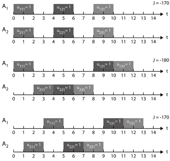 In this case, the MS job shop scheduling problem can be formulated as the following problem of OPC: it is necessary to find an allowable control , that ensures for the model (1) meeting of vector constraint functions , and guides the dynamic system (i.e., MS job shop schedule) from the initial state to the specified final state. If there are several allowable controls (schedules), then the best one (optimal) should be selected to maximize (minimize) . The formulated model is a linear, non-stationary, finite-dimensional, controlled differential system with the convex area of admissible control. Note that the boundary problem is a standard OPC problem ([21,36,37]). This model is linear in the state and control variables, and the objective is linear. The transfer of non-linearity to the constraint ensures convexity and allows use of interval constraints.