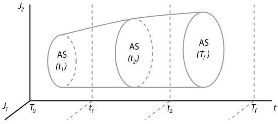 where —lower index which correspond to the motion control model, channel control model; operations control model; flow control; —resource control; operation parameters control; structure dynamic control model; auxiliary operation control model; is a vector of the MS generalized state, is a vector of generalized control, are known vector functions that are used for the state end conditions at the time points and , and the vector functions define the main spatio–temporal, technical, and technological conditions for MS execution; are indicators characterizing the different aspects of MS schedule quality.