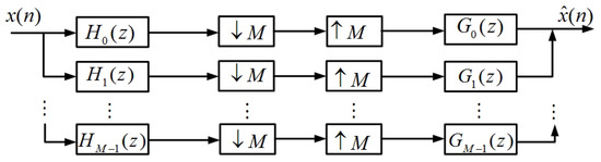 A M-channel maximally decimated filter bank as illustrated in Figure 1 is composed of M finite impulse response duration analysis filters with impulse responses , the down- and up- sampling by factor M of sub-band signals, and synthesis FIR filters . The impulse response of filter bank is obtained by cosine modulation with a low pass filter: