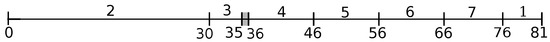 The initial partition is constructed based on the earliest kernel identified in the initial ED-schedule (one constructed for the originally given problem instance). This kernel already defines the corresponding two bins in that initial partition. For instance, in schedule S of Example 1 (Figure 1), kernel is detected, which already defines the two bins in that schedule. In the next generated complementary schedule (Figure 2), there arises a new kernel within the second bin. Note that the execution interval of kernel in schedules S and is different (it is in schedule S and in schedule ). Correspondingly, the first bin is extended up to time moment 35 in schedule S, and it is extended up to Time 30 in schedule . The newly arisen kernel defines two new bins in schedule ; hence, that schedule contains three bins, in total.