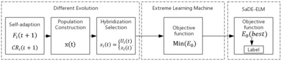 Since the ELM algorithm generates initialization parameters randomly, the initialization result has a significant impact on the output weight matrix. Therefore, In order to improve the efficiency of the ELM algorithm, based on the initialization results, a DE algorithm is introduced to solve the initial parameters of the ELM. However, there are unknown parameters that need to be initialized in the DE algorithm. If the artificial setting is based on experience, the result is subjective and the automatic diagnosis of the fault data cannot be achieved. So, in this study, we propose a SaDE-ELM algorithm, and optimize the DE algorithm to achieve the adaptive acquisition of unknown parameters of the DE algorithm, thereby improving the accuracy of fault diagnosis of SaDE-ELM. The flowchart is shown in Figure 4 below.