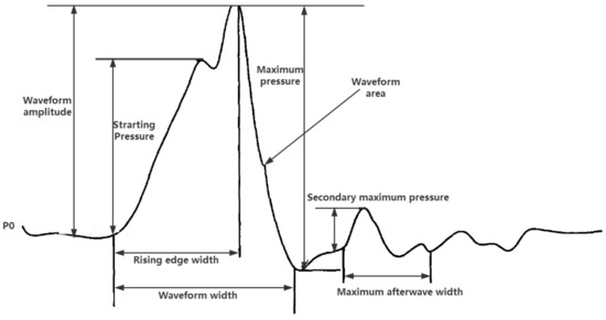 The marine fuel system is divided into two parts: the low-pressure oil line and the high-pressure oil line. The low-pressure oil line includes the fuel tank, the circulating pump, the fuel filter, and the low-pressure oil pipe. The high-pressure oil line mainly includes the injection pump, the injector, and the high-pressure oil pipe. The basic task of the marine fuel system is mainly accomplished by the high-pressure oil circuit, which is a key part of the oil supply system. The state information of the marine fuel system is mainly reflected in the pressure waveform of the high pressure fuel pipe. When a fault occurs somewhere, the original fuel supply state will change, and the pressure and tassel parameters of the fuel flow will change accordingly. The pressure waveform causes changes in the waveform shape and waveform parameter values. Therefore, this paper selects the pressure wave characteristics of the high-pressure pipe for fault analysis. In order to obtain better diagnostic results, the paper is based on literature research [33] and selects commonly used pressure wave feature as shown in the following Figure 7, including eight parameters of the maximum fuel injection pressure, injector valve opening pressure, sub-maximum pressure, waveform amplitude, rising edge width, waveform width, maximum residual width, waveform area.