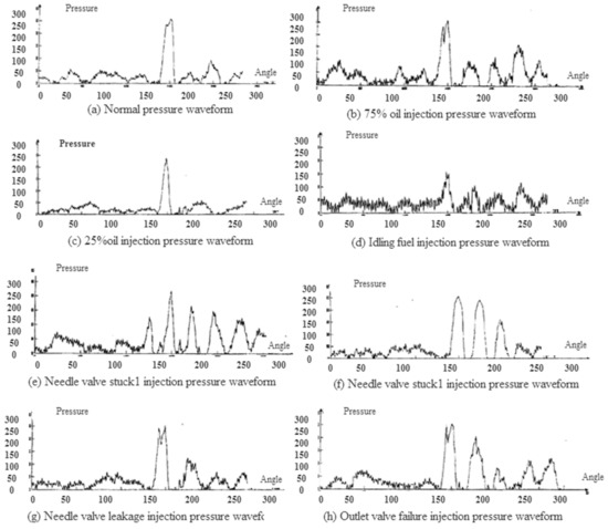One of the common faults of the fuel system is the poor quality fuel when the ship is refilling, which has caused some problems in the fuel system. According to the combination of different pressure waveform characteristics, the following types of marine fuel system states are formed: normal state, insufficient fuel supply (75% oil, 25% oil, idle oil volume), stuck needles to plug holes (small oil quantity, standard oil quantity), needle valve leakage, and oil valve failure. That is, eight sub-states, normal injection, 75% oil volume, 25% oil volume, idle oil volume, injector needle stuck 1, injector needle stuck 2, injector needle leakage, and high-pressure pump outlet valve failure [33]. Where the system state except the normal state belongs to the type of faults of the marine fuel system. In the condition of insufficient oil supply, the waveform will decrease with the decrease of oil supply, the waveform area will decrease, and the average waveform will also decrease. When the needle valve is located in faults, the pressure wave rises very quickly and the pressure wave curve is sharp. And the reflected wave is quite intense in the pipe, the durable time is longer, and the residual pressure is higher than the normal pressure. Compared the standard oil volume with the small oil volume, the amount of oil and residual pressure is greater, and the attenuation is faster. The leakage of the needle valve will cause the fuel pressure to drop; when the outlet valve fails, the residual pressure of the fuel is high, the pressure fluctuation is obvious, and the attenuation is slow.