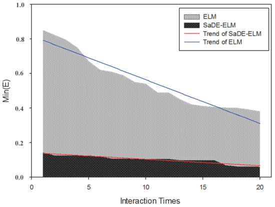 - The main parameters of SaDE-ELM: Scale factor F and hybrid probability CR. The parameters F and CR have a great influence on the convergence, stability and convergence speed of the DE algorithm. SaDE-ELM is proposed. The adjustment process of parameters F and CR is as follows:is the adaptive acquisition scaling factor. is the adaptive acquisition of hybrid probability and is an evenly distributed random number within the interval ; are evenly distributed random numbers within the interval . are adjustment parameters.