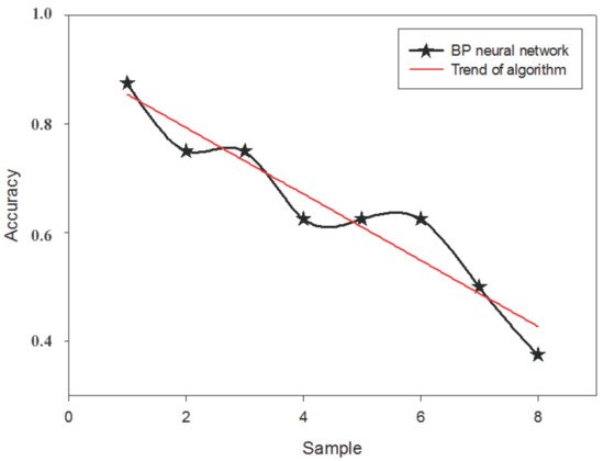 The BP neural network algorithm also belongs to a single hidden layer feed-forward neural network algorithm. The weight of the algorithm is utilized to judge the experimental accuracy of the entire algorithm [25]. However, its diagnostic effect on the faults of the marine fuel system is far worse than that of SaDE-ELM. The BP neural network algorithm and the conventional single hidden layer feedback neural network algorithm in the actual application process algorithm is easy to fall into a local minimum, resulting in the poor generalization of the algorithm.