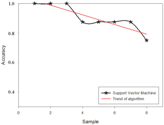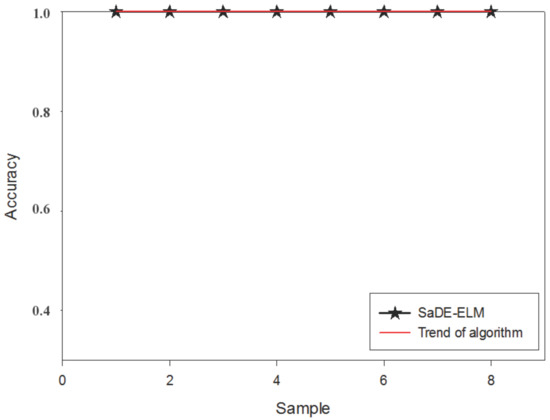 From Figure 11 to Figure 14, it can be seen that the fault diagnosis method of marine fuel system based on SaDE-ELM proposed in this paper can correctly identify each type of fault, and other three algorithms are certain error rate for the identification of eight types of samples, especially for the fourth type of sample—idle oil identification poor effect, and there have been errors. The reason is perhaps that the characteristics of this kind of sample are close to those of the type 3 sample, so the conventional fault diagnosis algorithm cannot be discriminated. The SaDE-ELM proposed in this paper can better identify the fuzzy faults of this kind of data features.