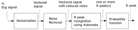 Figure 2 shows the proposed method comprising a preprocessing stage followed by a detection stage. The preprocessing stage has two internal phases involving vectorization and noise removal. This stage is meant to perform signal conditioning while reducing the amount of data, thereby making the succeeding step simpler and faster. After a signal suitable for processing is obtained, automata recognize the candidate R peaks from which a probability function selects the correct peak.