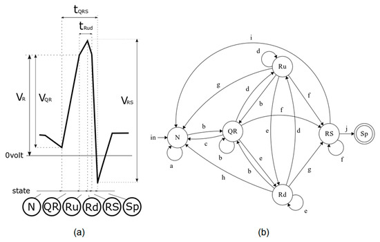 (a) Relation of the ECG signal sequence to the automata states and other ECG parameters and (b) the automata’s state transition diagram.