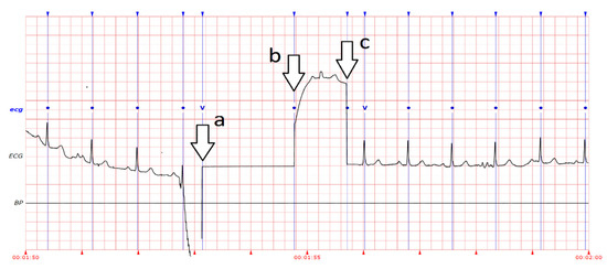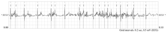 We focused on obtaining uninterrupted beats from the acquired ECG data. Thus, we included all signal series for the test with no exceptions. This allowed us to judge the detector’s ability to recognize unreadable signals caused by very-high amplitude noise, very-low signal amplitude, loss of signal, or a combination of these factors [15]. Such error signals were noted as “isolated QRS-like artefacts” instead of R peaks (Figure 6). We manually marked the R peaks and analyzed both signal types.