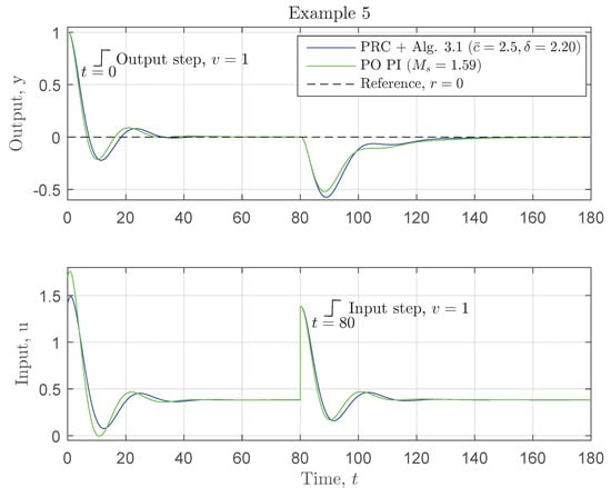 Example 5. Consider PI control of the higher order underdamped process model (Equation (48)). The figure illustrates the time-domain responses, given a prescribed robustness , of following methods: the PO PI and the PRC + Algorithm 1 where the MP parameter setting (proposed in Section 4) and RTDE . An output disturbance unit step is presented at time and an input disturbance unit step at time .