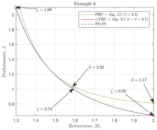 Example 6. PI control of the higher order underdamped process model (Equation (48)). The figure illustrates the trade-off curves with the Pareto performance objective J (Equation (41)) and robustness (Equation (10)). It shows the PO PI controllers with robustness and the ζ-PRC + Algorithm 1 variant where the RTDE is fixed and the main tuning parameter is ζ.
