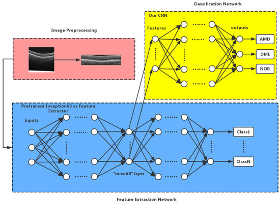 Our classification approach mainly consists of three parts, as illustrated in Figure 1: (1) preprocess the OCT B-scans to reduce the morphological variations; (2) apply a pre-trained Inception V3 architecture [41] on each OCT B-scan to extract its middle-level features automatically; (3) train the CNN to extract the semantic level features of OCT B-scans for image classification.