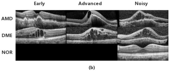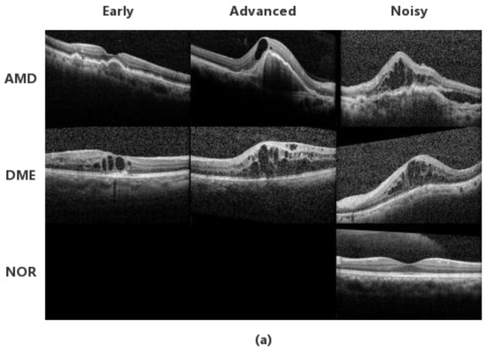 The macula, which is located in the central part of the retina, is the most sensitive area of vision. Its healthiness can be affected by a number of pathologies such as AMD and DME. As technology advances, OCT has been extensively used to capture the textural and morphological variations in the retina [1,2,3]. The ability to provide cross-sectional images of tissue makes it possible to diagnose AMD and DME [4,5,6].