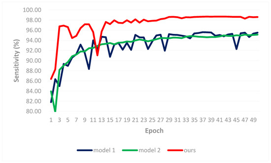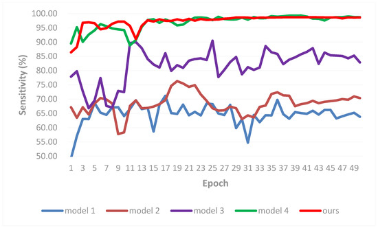 We build two classification models for comparison. The first model (model 1) extracts features from the bottleneck instead of middle layer and the features are sent to the CNN to extract advanced semantic features. Another model (model 2) extracts features from the “mixed8” layer (the output of InceptionD) but the features are used directly as input to the fully connected layer. The mean sensitivity of each model was shown in Figure 5. After 50 epochs for training, the sensitivity for model 1, model 2, and the proposed method are 95.52%, 95.13%, and 98.61%, respectively. From the result, we can conclude that: (1) Extracting the features from the middle layer is better than from the bottleneck in our case. (2) The CNN can effectively improve the classification accuracy.