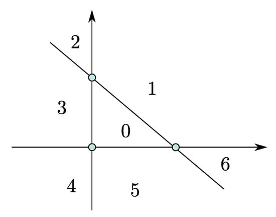 The calculations are implemented in double-precision floating-point arithmetic in C, and the tests are performed with squared distance s and its first and second derivatives. The first step is to determine the partition to which belongs (Figure 2). This step coincides with the original point-triangle algorithm [1], but subsequent calculations are extended to evaluate and . If belongs to partitions 1, 3, 5, then the point-line algorithm is invoked. For partitions 2, 4, 6, point–point calculations are performed. For partition 0, the point-plane algorithm is used.