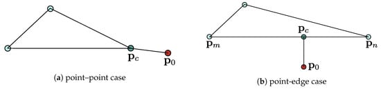 In the point-edge case, one of the barycentric coordinates of is zero, which simplifies Expression (2). Let and be the vertices of the edge, to which the closest point belongs ( Figure 3b). Then is expressed as the linear combination: