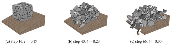 Cases with the lowest accuracy usually correspond to the variables whose absolute values are very small, and computer simulations are often robust against such cases. For example, results of the grain interaction simulation where the current algorithm is applied are shown on Figure 4. The simulation advances with large time steps even when multiple fragments interact with each other.