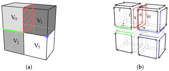 Illustration of a 3-map.Figure 1a shows an example of a 3D mesh composed of 4 volumes (, , ), 20 faces, 33 edges and 18 vertices. Note that and are adjacent; is incident to the red dashed face and to the green edge. To represent this 3D mesh with a 3-map, each volume is decomposed; then each face of the volumes is decomposed; then each edge of the faces is decomposed. The darts can be seen in the 3-map depicted in Figure 1b representing the 3D mesh of Figure 1a. Each dart is depicted by an oriented segment. At the end, the 3-map representing the 3D mesh has 96 darts (since each volume has 6 faces and each face has 4 edges, and thus, each volume is represented by 24 darts).