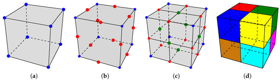 Hexahedral subdivision 1:8. (a) Initial hexahedron. (b) Split each edge in two. (c) Split each face in four. (d) Split the hexahedron in eight.