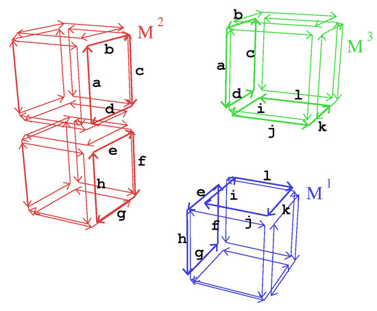Illustration with an example. In the example given in Figure 5, it is easy to verify that and mappings are directly retrieved from the corresponding mappings in each block. For , darts describing the face between the two cubes in block are not critical, and thus have their links directly given by the links in . However, this is not true for critical darts describing for example the face between and . For example, dart labeled a in is critical. The only other dart labeled a belongs to block and we conclude that these two darts are linked by .