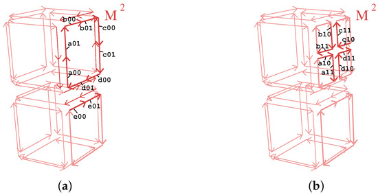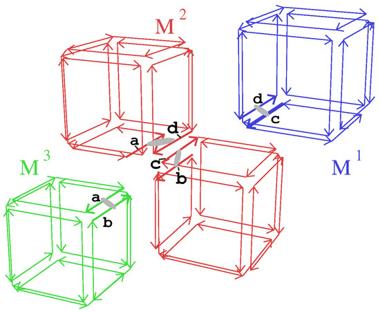 - Property (4) ensures that critical darts are labeled in a coherent way between the different blocks. In our example, critical darts of the top cube in block are labeled a, b, c, and d. Corresponding darts in block are also labeled a, b, c, and d. Starting from dart d labeled a in block and dart with the same label in block , we can check that darts and have the same label b. Step by step, this ensures the coherent labeling of all the darts of the two faces.