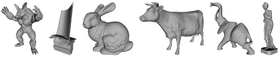 - Botsch, M.; Kobbelt, L.; Pauly, M.; Alliez, P.; Levy, B. Polygon Mesh Processing; AK Peters: Natick, MA, USA, 2010. [Google Scholar]