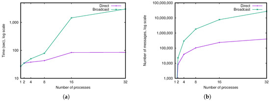 Comparison of two possible communication methods, for increasing number of processes (from 1 to 32). “Direct”: messages are sent directly to concerned blocks; “Broadcast”: messages are sent to all processes. (a) Total computation time, in seconds, average for the six meshes. (b) Number of messages exchanged, average for the six meshes.