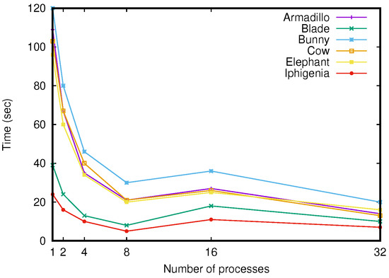 We can see in Figure 11 the overall computation time of our subdivision method, depending on the number of processes, for each mesh. On average, the method takes 82 s for one process, and 13 s for 32 processes. The speedup is thus about . This time saving is interesting, even if we are far from the maximal possible speedup of 32. This difference is explained by the cost of the message passing.