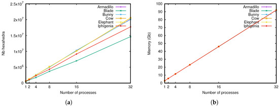 Comparison of maximal number of hexahedra and memory space occupied when using a 3-dmap for different number of processes. (a) Final number of hexahedra. (b) Maximal memory space occupied (in gigabytes). The six curves are superposed, because all runs occupy the same maximum memory space.