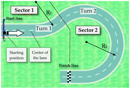 The flexibility and openness of TORCS allowed us to develop a dedicated track for testing the discussed steering approaches of the car. The layout of the track is a variant of the so-called “fish hook” requiring a “road edge recovery maneuver” [22]. It is often used for testing the dynamics (especially the tendency for a rollover) of real-world vehicles. It consists of two sectors: Sector 1, including a short straight followed by a left turn, and Sector 2, including a single, long 180° right turn. The track is illustrated in Figure 2, and its main characteristics are given in Table 2. The coefficient of friction µ between the tires of the car and the surface of the track could be set in TORCS to the values corresponding to dry (µ = 0.8, 1.0), rainy (µ = 0.5, 0.6), snowy (µ = 0.4), and icy (µ = 0.3) conditions, respectively.
