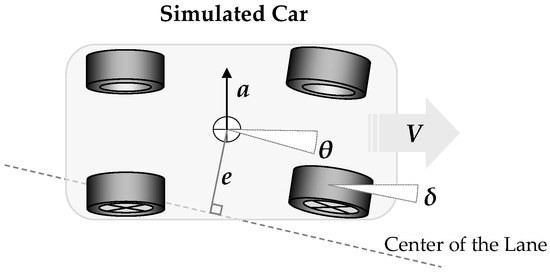 The first of the three steering controllers that we investigated is based on the servo-control model of steering. It represents the canonical approach of defining the instant value of the steering angle in autonomous cars [23,24]. According to this model, the SAF that defines the steering angle δ is assumed to be the sum of the following two scaled parameters: the linear e and angular θ deviations of the car from its desired trajectory (e.g., the center of the lane) as illustrated in Figure 3. The SAF of the servo control model could be expressed as the following Equation (1):