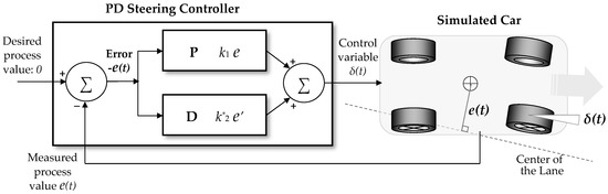 Equation (6) expresses the servo-control model of steering as a PD controller. Its output—the control variable—the steering angle δ, is a sum of the proportional (P) and derivative (D) terms of the error: the deviation of the car from the center of the lane e. Because the desired process value (i.e., the desired deviation from the center of the lane) is 0, the absolute value of the error e is equal to the measured process value. The controller attempts to minimize the value of the error by constantly adjusting the steering angle δ, which, presumably, would yield a trajectory as close as possible to the center of the lane (Figure 4). We will explain the mechanism of tuning the parameters k1 and k*2 in Section 3.