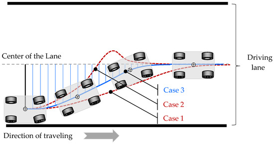 The speed of the car is kept constant during the trial by a simple, handcrafted cruise control mechanism that maps the difference between the desired speed (e.g., as shown in Table 3, 13.3 m/s for the trial on a track with friction coefficient µ = 0.5) and the actual one into an increment (or decrement) of the position of the accelerator pedal. As the car reaches the desired speed, the steering of the car is assumed by the evolved SAF. Then, the SAF starts to continuously (with a sampling frequency of 40 Hz) produce the desired steering angle δ calculated for the currently perceived values of the parameters pertinent to the state of the car. The intended, optimal, trajectory of the car steered by the evolved SAF should feature both a quick and smooth return to the center of the lane followed by a precise drive along it (Figure 6, Case 3). We view the trajectories shown in Figure 6 as Case 1 and Case 2 as suboptimal, as they represent either a too-slow (Case 1), or a too-quick, oscillating return (Case 3), respectively. Indeed, a too-slow return would be unable to either follow adequately the center of the lane on cornering or to return to it in a case of deviating from it due to skidding on slippery roads. On the other hand, a too-quick return would imply an inherently oscillating trajectory of the recovery.