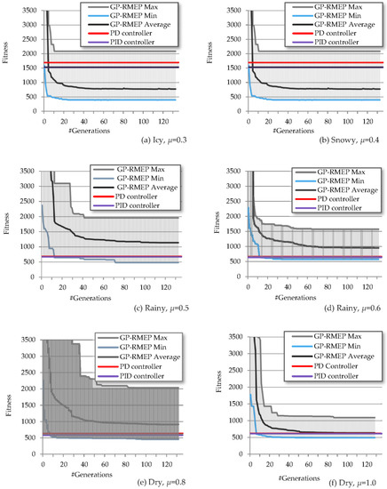 The lack of generality is one of the well-documented drawbacks of solutions obtained via GP [4,5,26] that hinders the applicability of this algorithm to real-world problems. Indeed, we could not be sure about how well the SAF that was evolved in a single car driven at a fixed speed on a fixed track featuring a fixed coefficient of friction would perform in different situation(s). Ultimately, we should have considered an evolving SAF that performs (nearly) equally well on several fitness cases that correspond to these different conditions. Moreover, in order to bridge the inevitable reality gap, we should have implemented an evolutionary adaptation of a set of the best SAFs, evolved on the simulated car, to a real one driven on a real track. However, in our current, seminal work, we will report the results of testing the best SAF evolved via GP with a single fitness case (fixed track, fixed coefficient of friction, and driven at fixed speed V = 0.85 VCR) in different road conditions. As shown in Figure 8, all GP-RMEP controllers, evolved for a particular slippery condition (e.g., for µ equal to 0.3, 0.4, 0.5, or 0.6, respectively) feature a reasonably small degradation (if any) when tested in different (unforeseen during the evolution) road conditions.