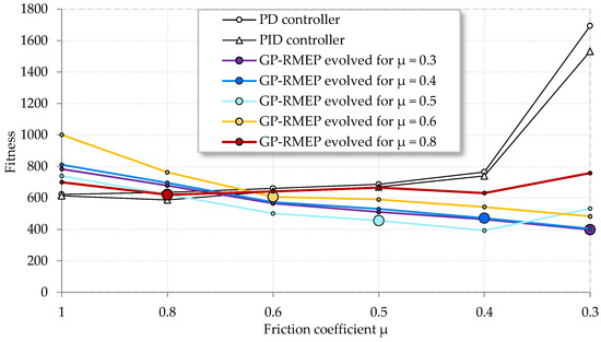 Generality of the best-evolved steering functions manifested by a reasonable change in their respective fitness value when tested on different (unforeseen during the evolution) friction coefficients. The fitness of the steering functions evolved for a particular friction coefficient is indicated by larger circular markers.