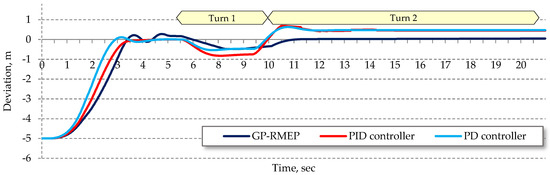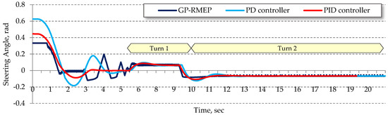 The dynamics of the steering angle and the deviation from the center of the lane of the car steered by the sample best-evolved SAF shown in Equation (8) in snowy (µ = 0.5) road conditions are illustrated in Figure 9 and Figure 10, respectively. The same figures also show the behavior of the car steered by the best PD and PID controllers with values of parameters optimized for this particular road condition (as shown in Table 5). As these two figures illustrate, the lateral deviation of the car steered by the sample best-evolved steering function is significantly lower than that of the best solution of the servo-control model, especially during steady-state cornering in the left Turn 1 and right Turn 2. Also, during the transition between these two turns the steering is smoother and more stable (non-oscillatory).