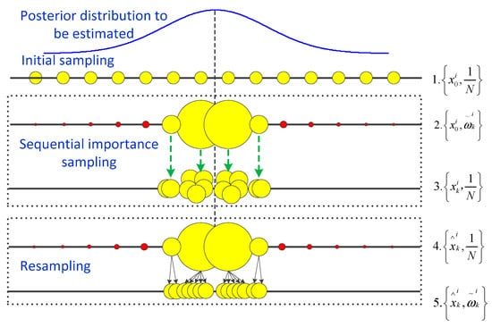 The PFF is a sequential series simulation-based algorithm based on a recursive Bayesian filter (RBF), which utilizes the Monte Carlo (MC) algorithm to constantly adjust the weight and position of the samples (called particles) and revise the original experience conditional distribution according to the adjusted particle information [25,26,27]. Actually, it uses the particles and its weights as a discrete random metric to approximate and accordingly update the related probability distribution (RPD).