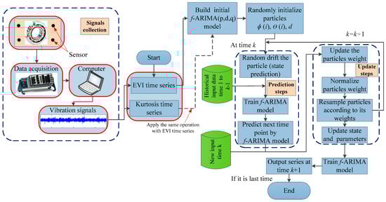 Initially, the LRD model (e.g., f-ARIMA) is defined as , the particular modeling process can refer to [15,30,31], the AR coefficients ϕ(1), ϕ(2), ϕ(3), …, ϕ(p), MA coefficients θ(1), θ(2), θ(3), …, θ(q), wherein the parameters p and q can be calculated by the Akaike information criterion (AIC) [32,33]. The AR coefficients, MA coefficients, and the fractional differencing parameter d are modeled as probability distributions following a certain distribution (called particles). The initial distribution of model parameters can determine the performance of sequential importance sampling (SIS) of PFF. In the update stage, the unknown parameters combined with the state transition probability p(xk|xk−1) can be estimated recursively. Once the update measurements stop, the posterior distribution function p(xk+l|xk) can be calculated to predict a one-step ahead EVI time series based on the latest updated parameters distribution. Furthermore, multi-step (here the step length is L = 40) ahead prognostics can be obtained by performing the prediction process in Bayesian inference. In this experiment, the proposed model is applied to predict 40 points vibration intensity ahead; i.e., 400 min in advance.